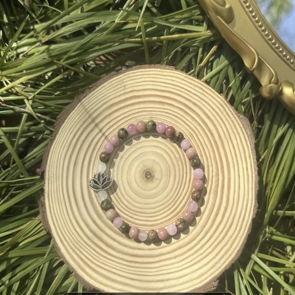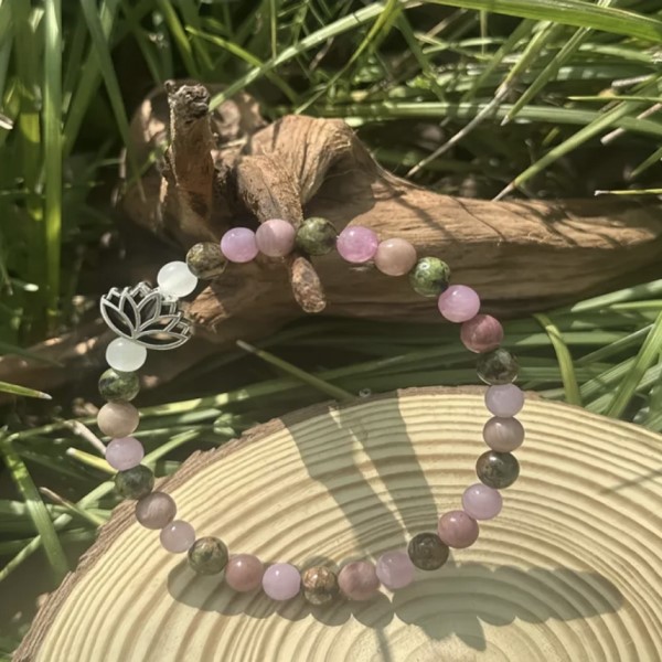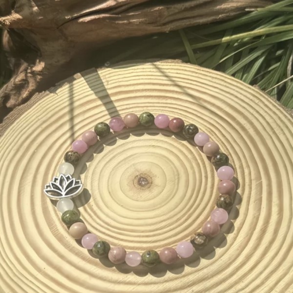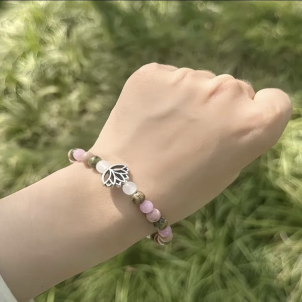 A karkötő ásványkristályai: hegyikristály, rózsakvarc, faachát és holdkő lótusz virággal.